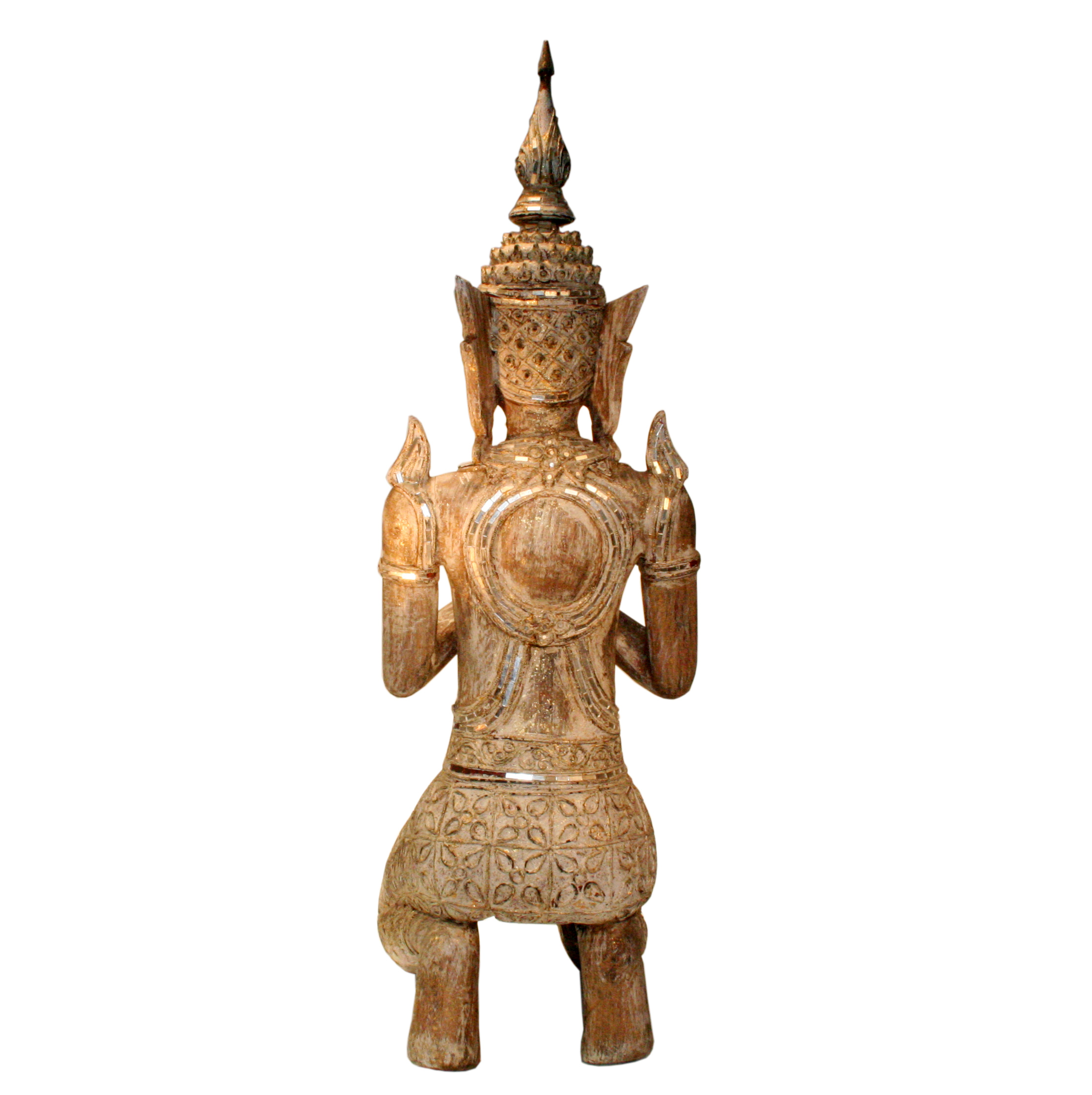 Mit sanfter Patina, gealtertem Charme und einem Hauch vergangener Tempelzeit erzählt dieser Thepanom Engel eine stille Geschichte – von Achtsamkeit, Schutz und tiefem spirituellem Erbe. In traditioneller Gebetshaltung gefertigt, bewahrt er die Formensprache buddhistischer Kunst, jedoch mit einem bewusst „shaby“ Finish, das ihn wie ein Relikt aus längst vergangener Zeit erscheinen lässt.