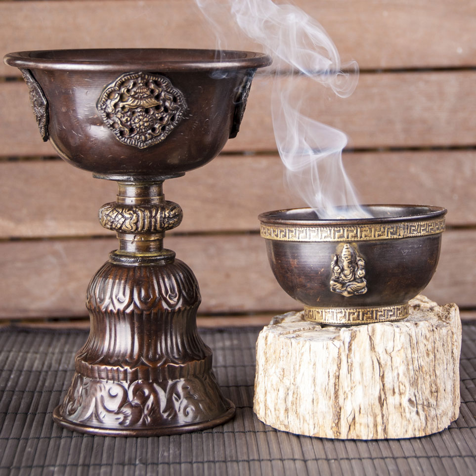 Zum Räuchern mit Sand befüllen und die Kohle dann in das Gefäß legen. Jedoch Vorsicht, das Räuchergefäß kann durch die leitenden Eigenschaften des Kupfers sehr heiß werden. Da Kupfer nach Gold am höchsten schwingt, sind diese Schälchen besonders für Rituale aller Art geeignet.