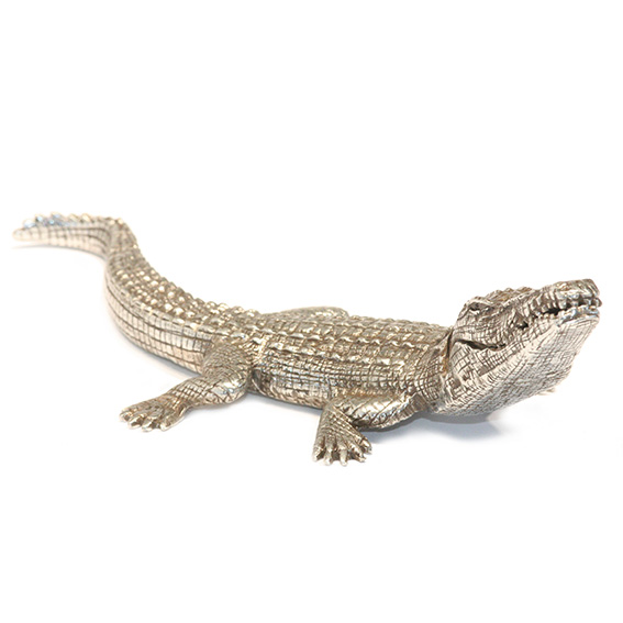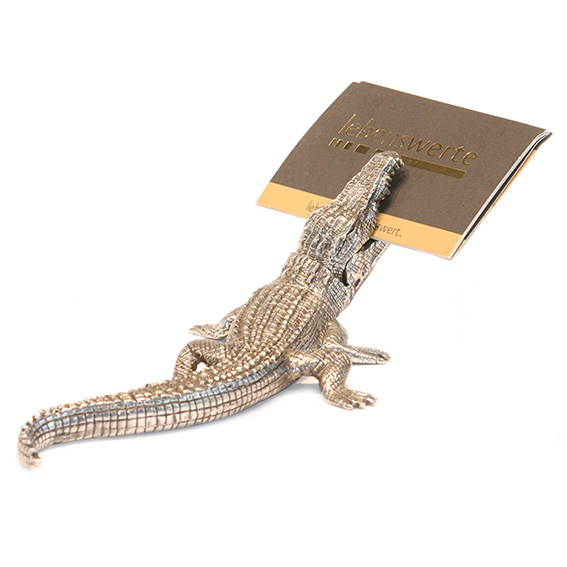 Der Briefbeschwerer "Krokodil" wird in liebevoller Handarbeit von LOYFAR in Nordthailand hergestellt. Material: 90% Zinn und 10% Silber. Das Finishing glänzt wie Sterling Silber. Das Zinn ist natürlich 100% bleifrei.