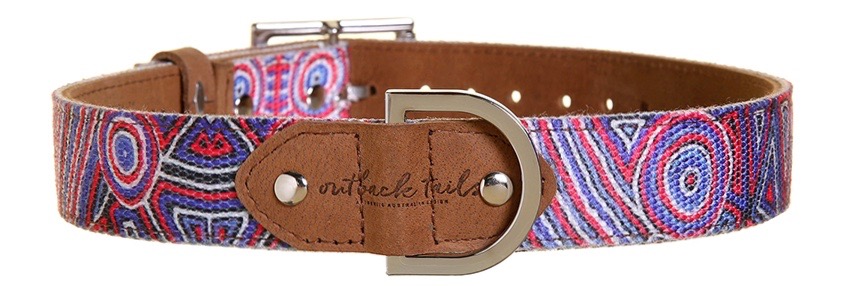 Die langlebigen Hundehalsbänder "Digging for Truffles" von Outback Tails werden aus feinem, weichen Qualitätsleder und Nylon, das mit der schönen Artwork der Warlukurlangu Artist Aboriginal Corporation verziert ist, gefertigt und sind auch für höchste Beanspruchungen geeignet.