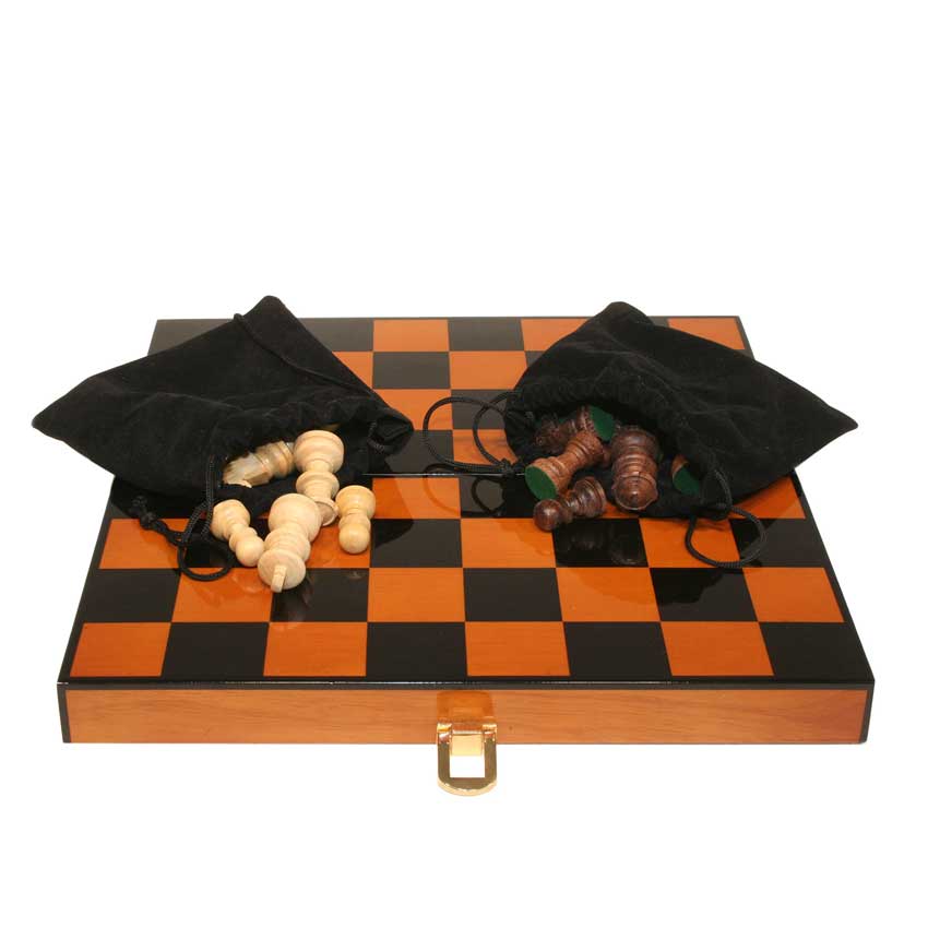 Maße der geschlossenen Spielebox aus Walnussholz: Höhe ca. 6 cm, Breite ca. 28 cm, Tiefe ca. 14 cm.