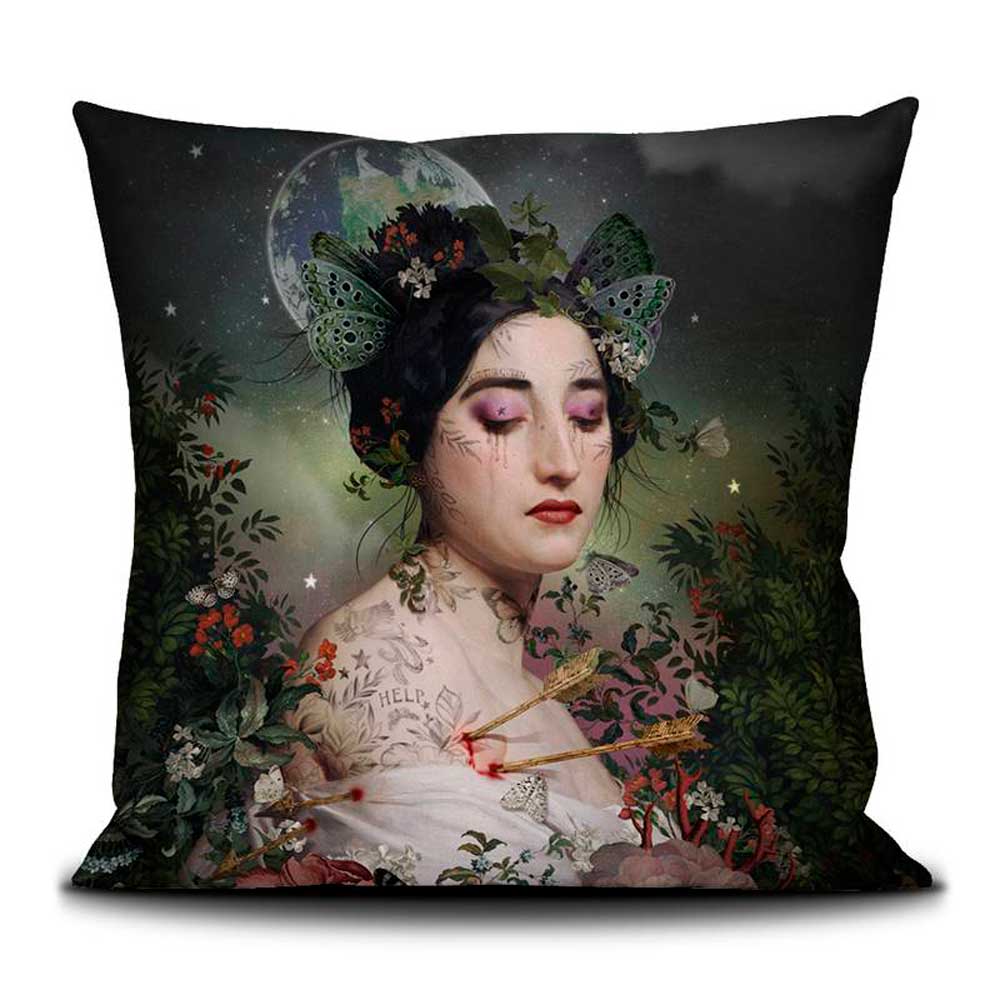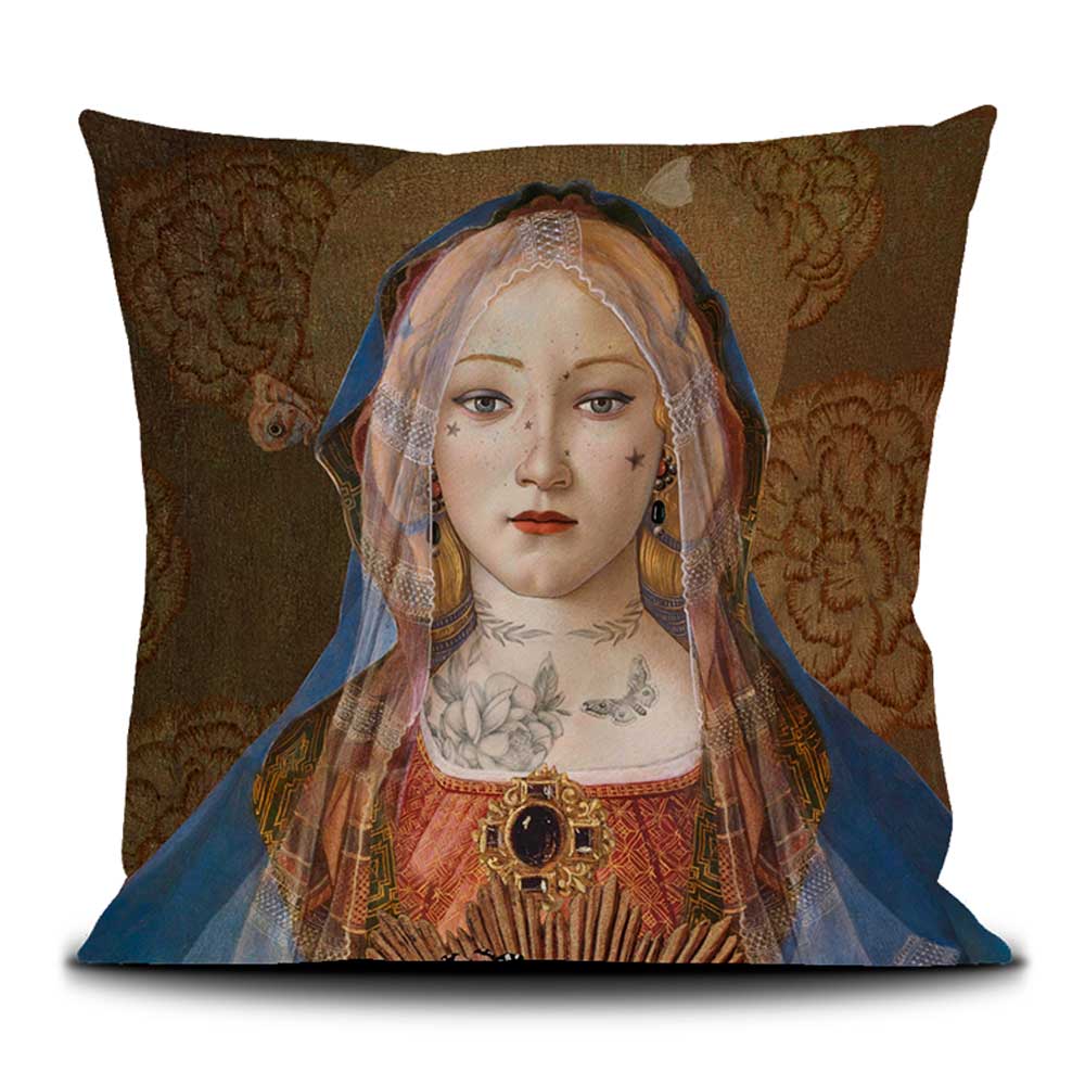 barocke Symbolik und moderne Street-Art zu unverwechselbaren Designkissen verbinden. Die Künstlerin Bénédicte erschafft Motive, die Geschichten tragen: sinnliche Portraits, florale Opulenz, mystische Figuren und ikonische Details,