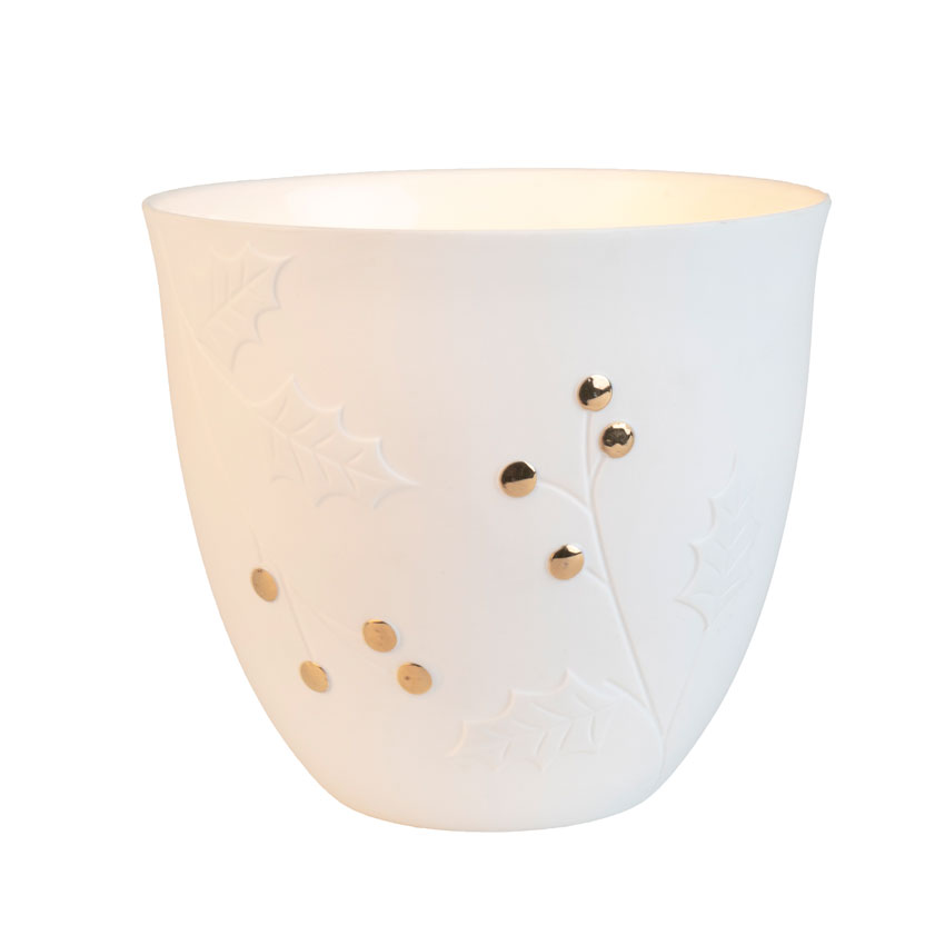 Die Maße: Ø 13,5 cm, Höhe 12 cm. Material: weisses Porzellan unglasiert, mit Prägung, Relief, Lochstanzung und gold glasierten Details.