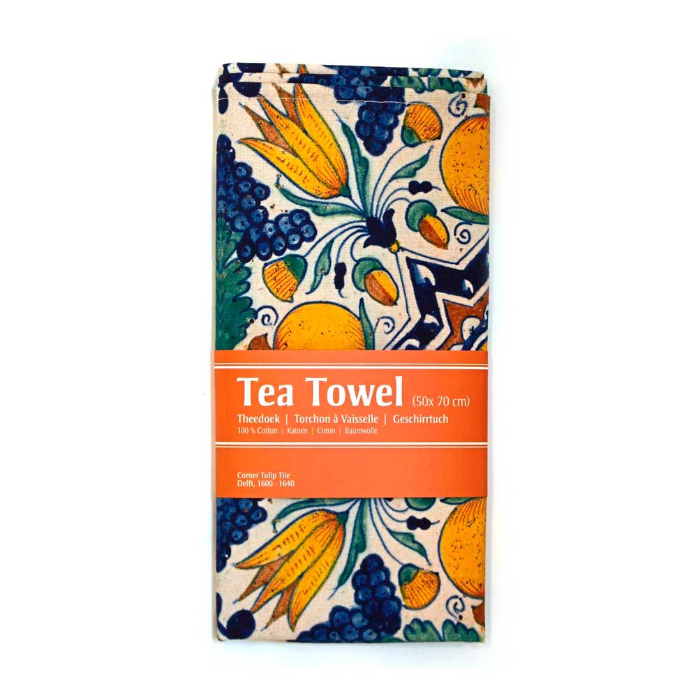 Dieses kunstvoll bedruckte Geschirrtuch bringt die reiche Ornamentik der historischen Polychrome Tulip Corner Tiles in Ihr Zuhause. Die warmen Gelb- und Blautöne, kombiniert mit feinen floralen Details, verleihen Ihrer Küche mediterrane Leichtigkeit und eine besondere dekorative Note – funktional und stilvoll zugleich.
