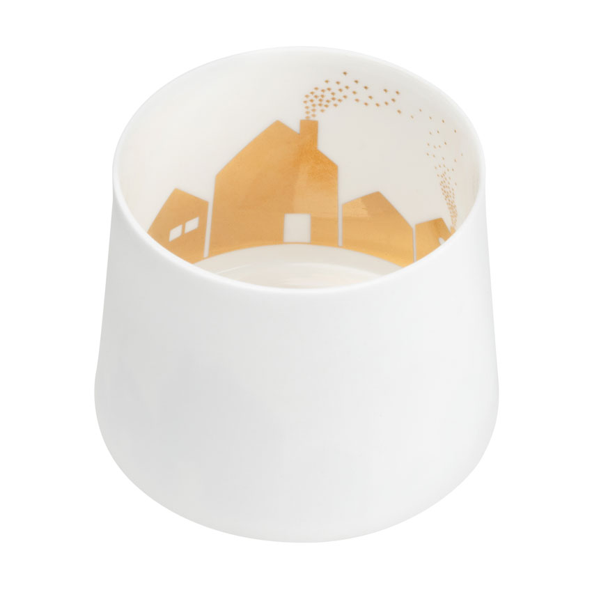 Die Maße: Ø 7,5 cm, Höhe 6,5 cm. Material: Porzellan, innen glasiert, außen matt mit Decal in gold.