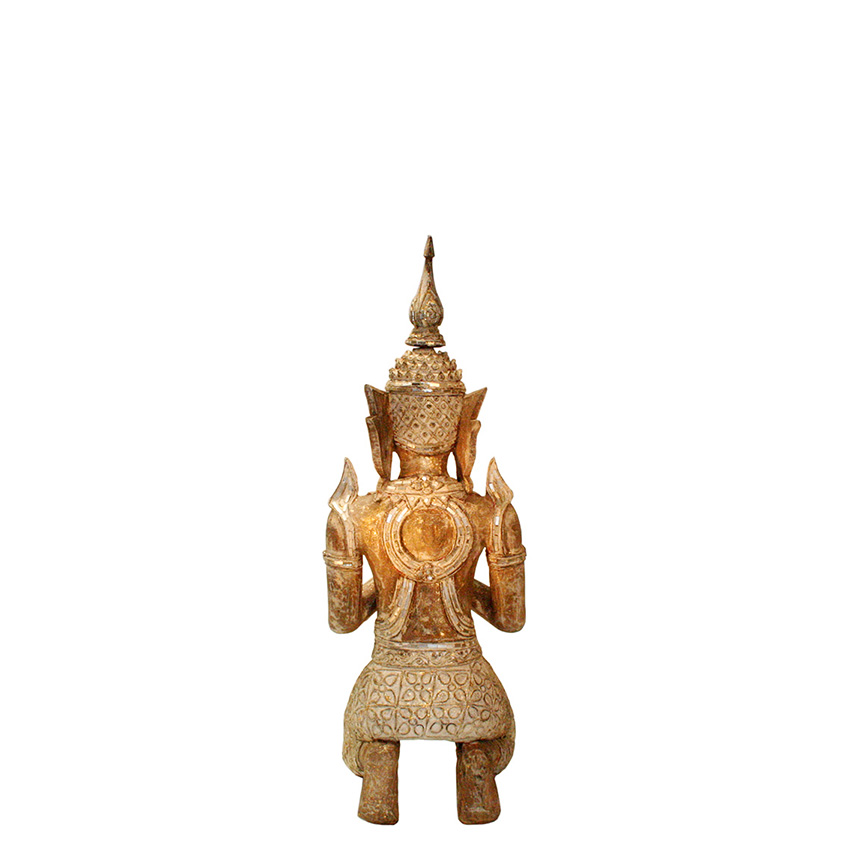 Mit einer Höhe von 78 cm ist dieser Thepanom Engel ein kraftvoller Blickfang – und doch von stiller, fast meditativer Ausstrahlung. In traditioneller Gebetshaltung gefertigt, trägt er die Spuren der Zeit mit Würde: ein gealtertes Finish, dezente Farbnuancen und eine matte Oberfläche, die ihn wie ein Tempelhüter aus einer anderen Epoche erscheinen lässt.