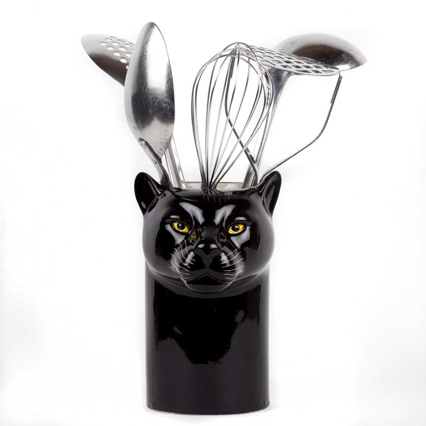 Ein in vielfältiger Weise zu benutzender Behälter aus hochwertiger Keramik in Pantherform. Handgefertigt und handbemalt ist der Keramikbehälter in realistisch, liebenswerter Pantheroptik ideal zum Aufbewahren von Küchenutensilien. Auch als stilvolle kleine Blumenvase ist der Panthertopf von Quail Ceramics bestens geeignet. Der Utensilien Pot "Panther" ist Spülmaschinenfest.