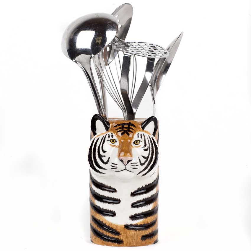 Ein in vielfältiger Weise zu benutzender Behälter aus hochwertiger Keramik in Tigerform. Handgefertigt und handbemalt ist der Keramikbehälter in realistisch, liebenswerter Tigeroptik ideal zum Aufbewahren von Küchenutensilien. Auch als stilvolle kleine Blumenvase ist der Tigertopf von Quail Ceramics bestens geeignet. Der Utensilien Pot "Tiger" ist Spülmaschinenfest.