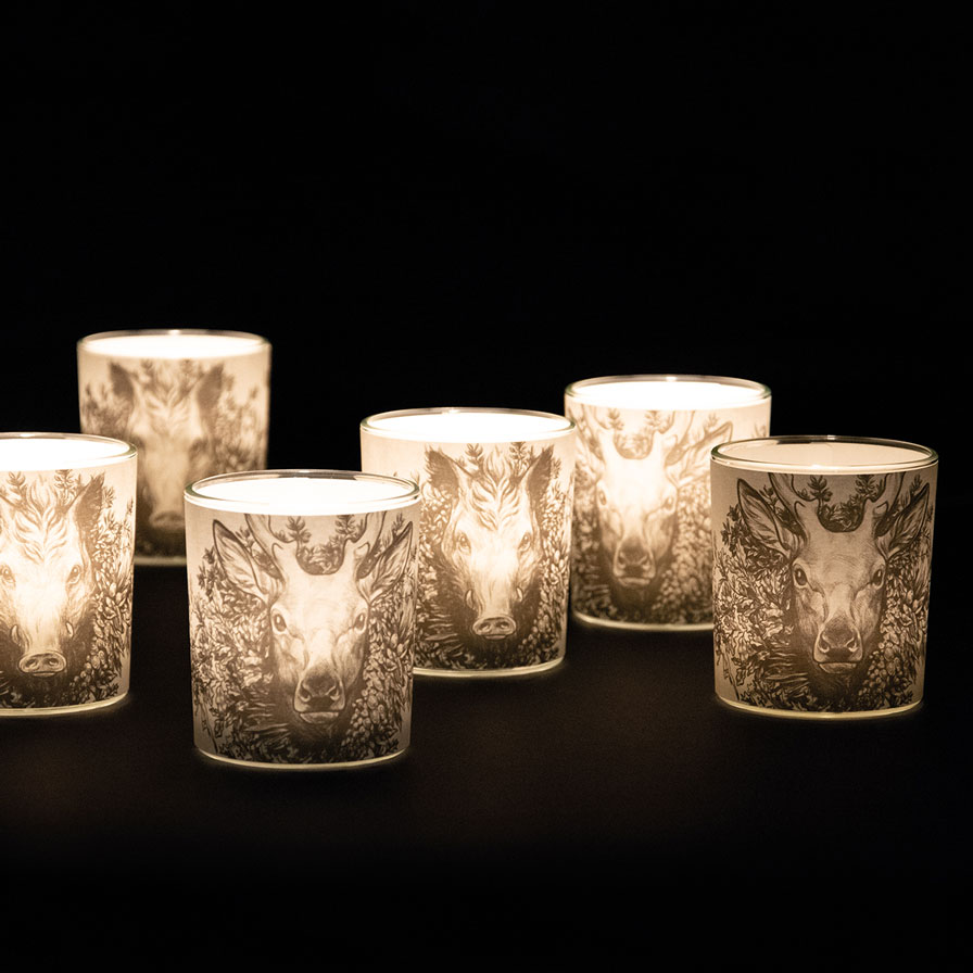 Die detailreichen Motive sind gedruckt auf einer weißen, lichtdurchlässigen Papierbanderole mit feiner Leinenstruktur. Diese umschließt das Kerzenglas und ist unter dem schwebenden Siegel der Kerzenmanufaktur auf der Rückseite verschlossen. Der warme Kerzenschein lässt die Motive ganz besonders schön wirken.